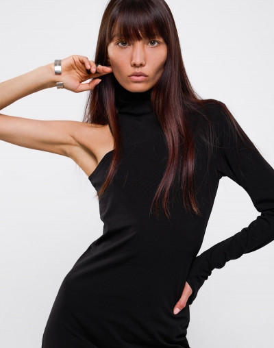 Платье с геометрическим вырезом для одной руки и одним рукавом с вырезом для большого пальца. Асимметричная юбка подчеркивает вашу индивидуальность.