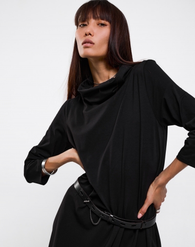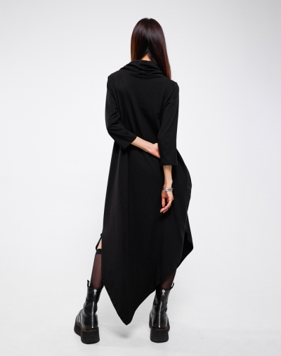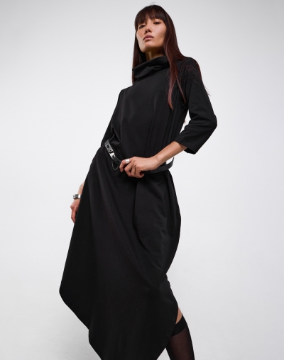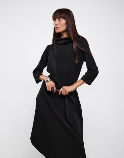 Платье свободного кроя с воротом-хомутом и асимметричной юбкой. Лаконичное и практичное - оно станет номером один в любом гардеробе.