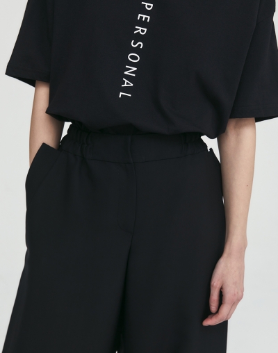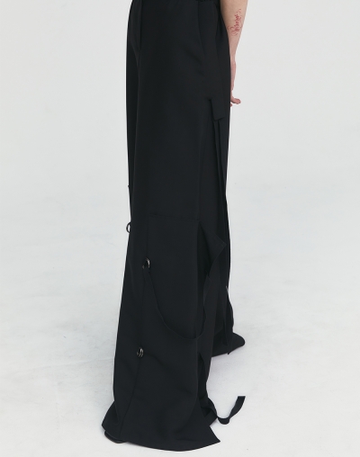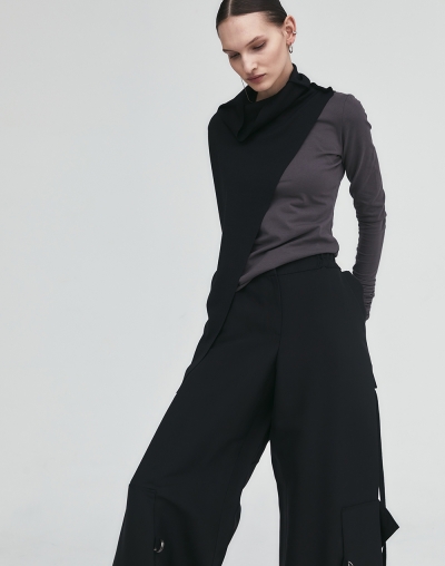 Брюки широкого кроя на резинке с декоративными деталями-наколенниками. Фиксация наколенников за счет ремешков и металлических застежек-полуколец. Широкие штанины-трубы из плотного хлопка. Пояс на резинке