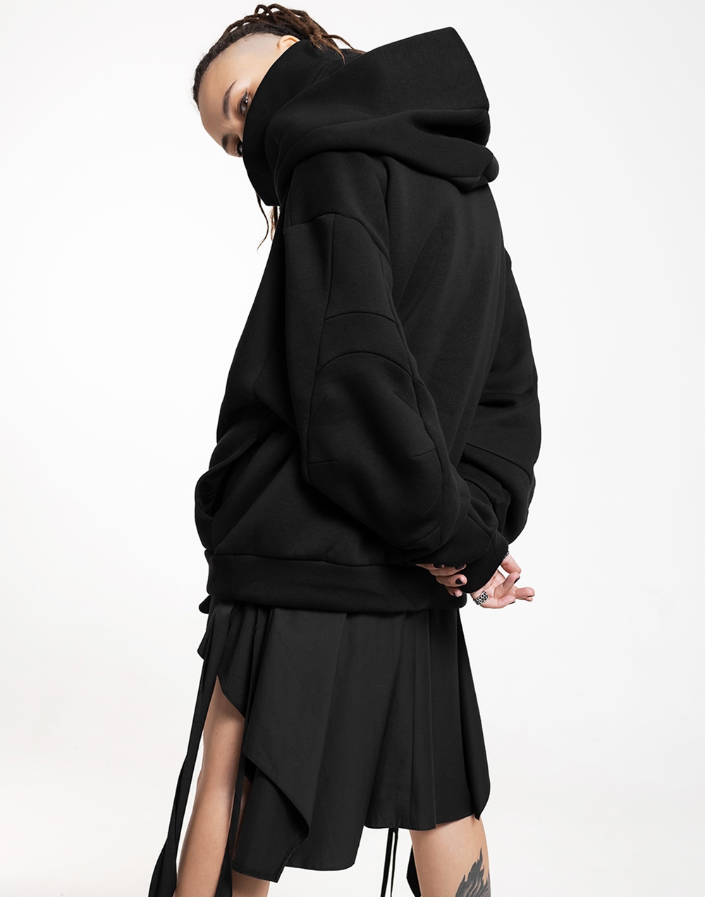 Толстовка с высоким воротником, глубоким капюшоном и геометричными швами. Толстовка, в которую можно провалиться с головой.