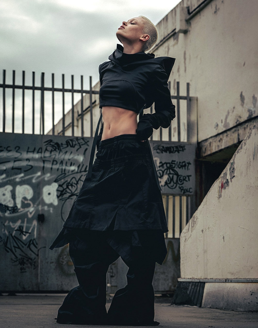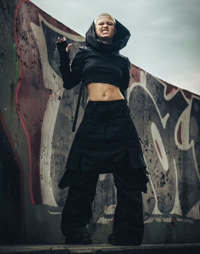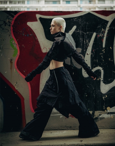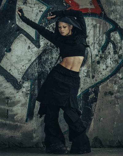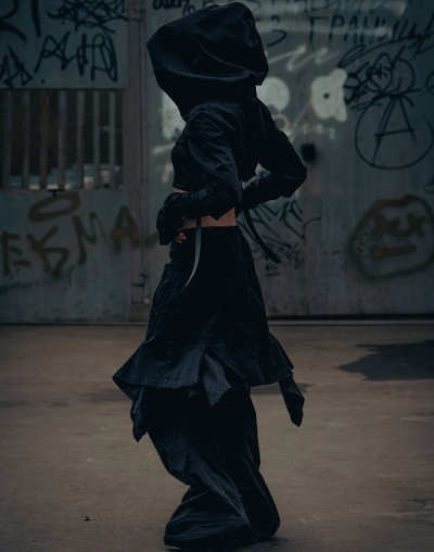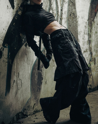 Так же устроены и они - многослойные брюки из тактильного твила с двойным поясом, создающим эффект сверх низкой посадки, декоративной вшитой юбкой, и кнопками на щиколотках, с помощью которых можно регулировать длину штанин.