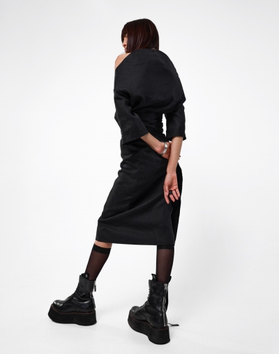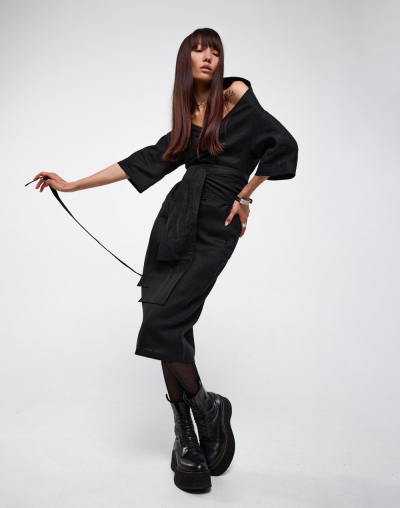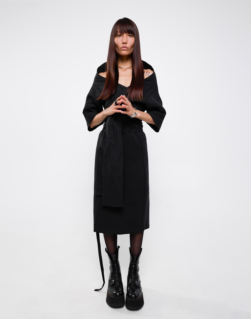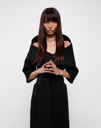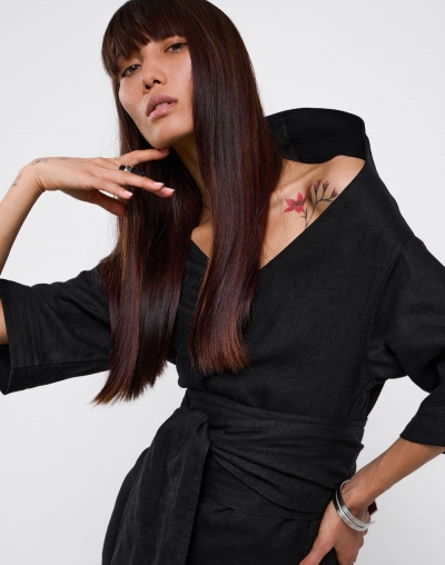 Изысканное кимоно с рукавом 3/4 и широким воротником-стойкой на спинке. Идеально садится по фигуре, широкий пояс подчеркивает талию и утончает силуэт. Открытые плечи и деликатное декольте. Женственность и сексуальность в каждой детали.