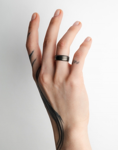 Кольцо из нержавеющей стали с тонкой фактурой, подчеркнутой легким чернением.