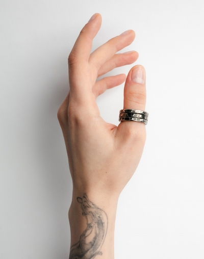 Массивное кольцо из серии «Сегменты» шириной 9мм и толщиной 3мм. Процесс изготовления этой формы скорее напоминает работу кузнеца, чем ювелира. Тройное кольцо станет любимым у тех, кому нравится не только видеть кольцо на своей руке, но и ощущать его объём и массу.